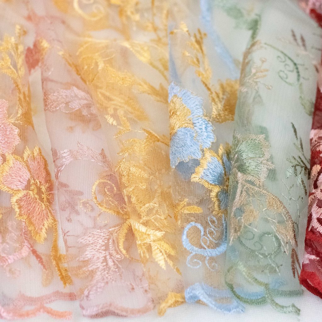 Embroidered fabric is textile material that has been decorated with embroidery, a process of stitching thread onto the fabric to create designs or patterns. It can be used for clothing, home decor, and accessories, adding a unique touch and intricate detail to any project.